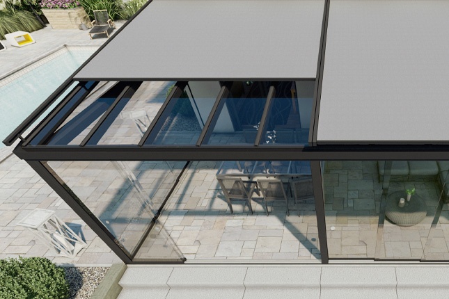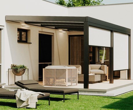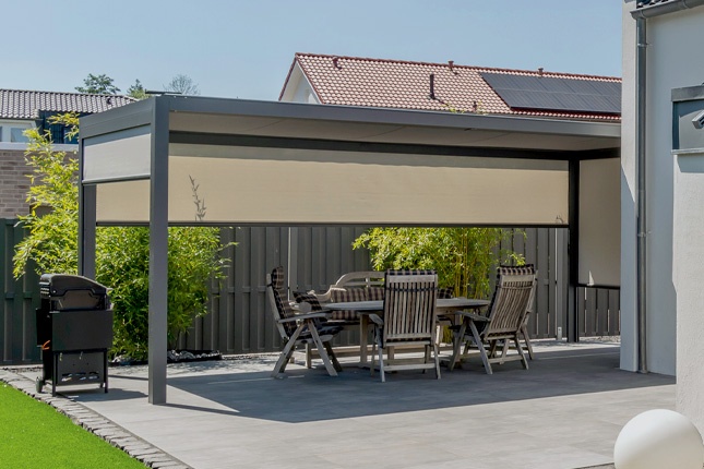 Die Senkrechtmarkise bietet Schutz vor tiefer Sonne und neugierigen Blicken. Diese Seitenlösung kann fest integriert oder als Zusatzmarkise am Ende der Überdachung installiert werden, entweder manuell heruntergekurbelt oder automatisch heruntergelassen.