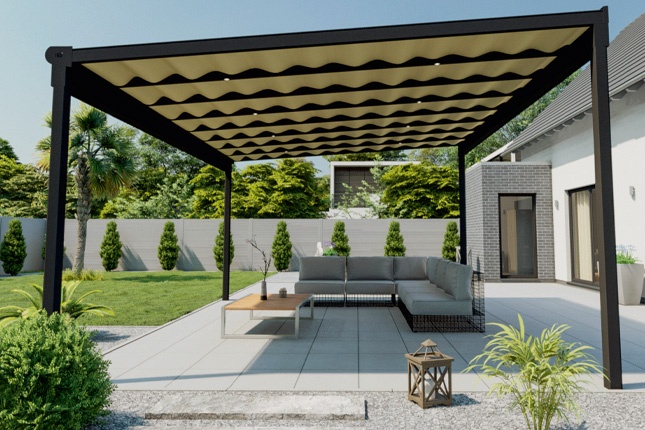 Die Aufdachmarkise verfügt über einen elektrischen Antrieb, der mit dem mitgelieferten Schalter oder optional mit einer Fernbedienung bedient wird. Sie ist oben auf dem Dach montiert, was Niederschlägen und Wind freien Lauf lässt. Die Markise kann mit Regen-, Wind- und Sonnensensoren ausgestattet werden, die automatisch das System schließen, um Schäden zu vermeiden und Ihnen sorgenfreies Verlassen des Hauses zu ermöglichen.